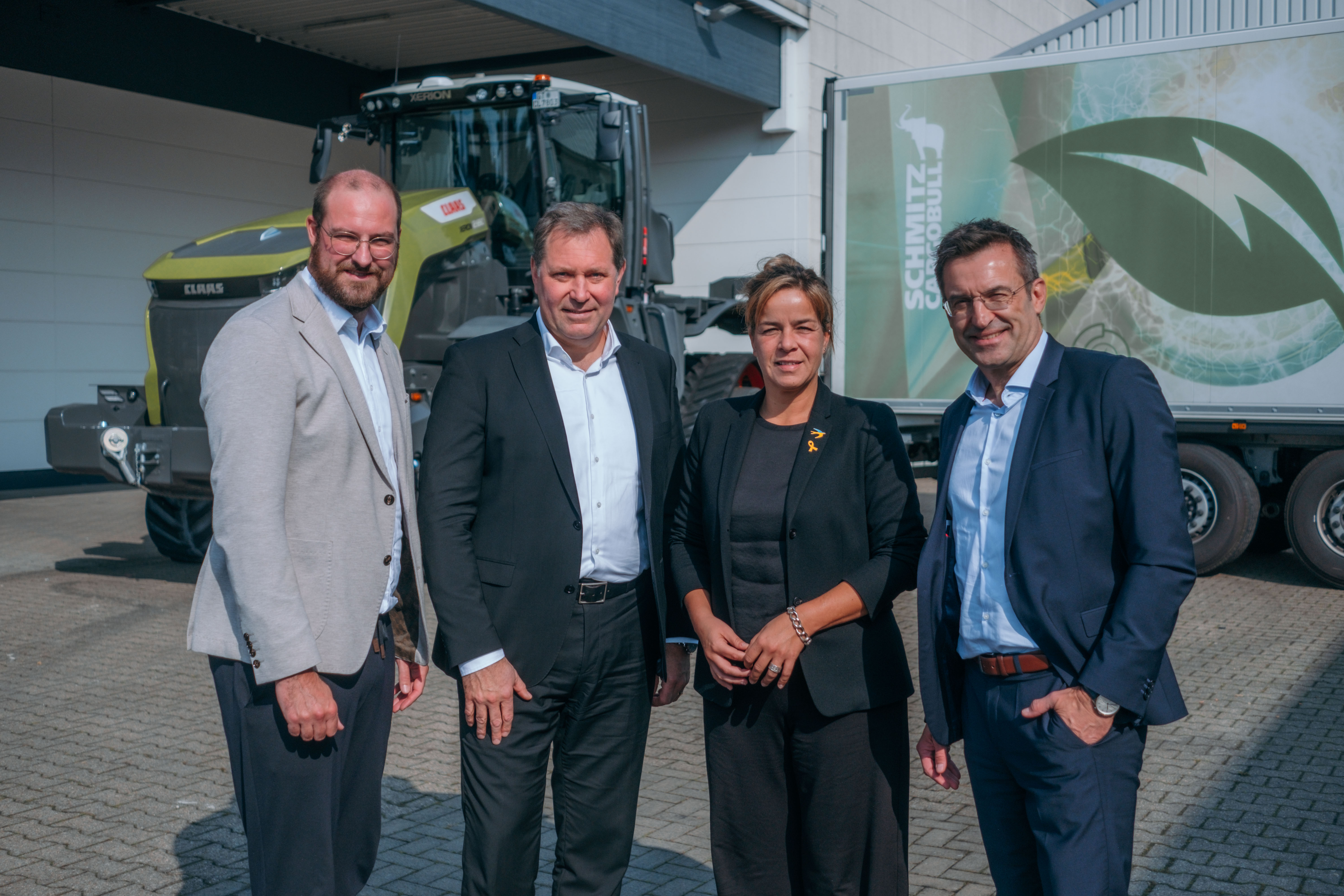 Bild: v.l. Dr. Arno Kühn (it‘s OWL), Jan-Hendrik Mohr (CEO CLAAS), Mona Neubaur (Ministerin für Wirtschaft, Industrie, Klimaschutz und Energie des Landes Nordrhein-Westfalen), Dr. Günther Schweitzer (COO Schmitz Cargobull)