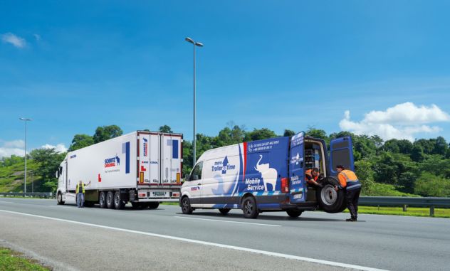 Qualifizierte Fachkräfte sorgen für eine schnelle und zuverlässige Durchführung aller Arbeiten für Trailer, Kühlgeräte und Reifen und verwenden ausschließlich von Schmitz Cargobull qualifizierte Ersatzteile, d. h. OE-Ersatzteile sowie auch „Value Parts“. Mit dem neuen mobilen Service von Schmitz Cargobull profitieren Kunden von höchster Flexibilität und Effizienz, um Ihre Betriebsabläufe optimal zu unterstützen. Das mobile Serviceangebot umfasst Pannenservice, Inspektion, Wartung, Instandsetzung (Reparatur) und Nachrüstung sowie technische Betreuung und Schulung vor Ort für Kunden und Service Partner. Der Produktumfang umfasst sowohl die Kühlmaschine als auch den Trailer für Schmitz Cargobull Fahrzeuge und Fremdfabrikate, einschließlich der Telematik.
