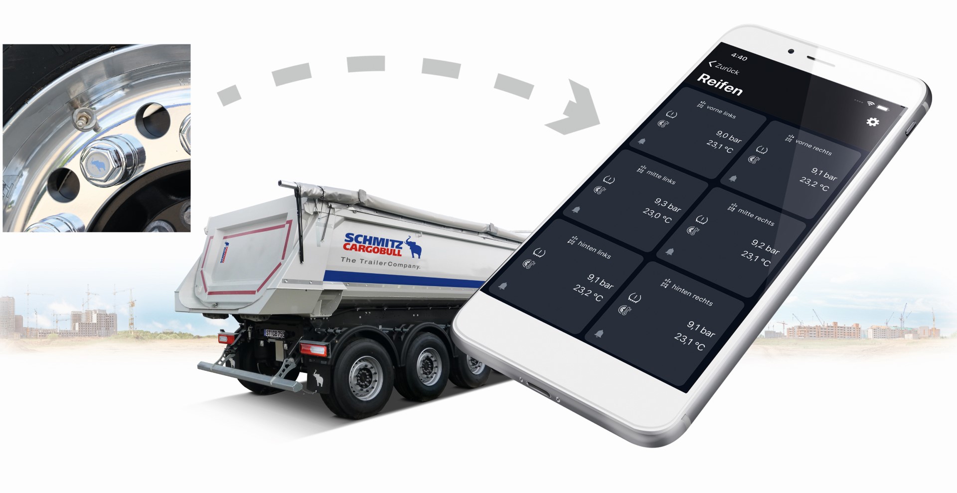 Das Reifendruckkontrollsystem wird über die Schmitz Cargobull Trailer-Telematik TrailerConnect® CTU3 gesteuert. Der Reifendruck und die Reifentemperatur können von jedem einzelnen Reifen unter Angabe der Radposition im TrailerConnect® Portal und auch in der beSmart-App eingesehen werden.