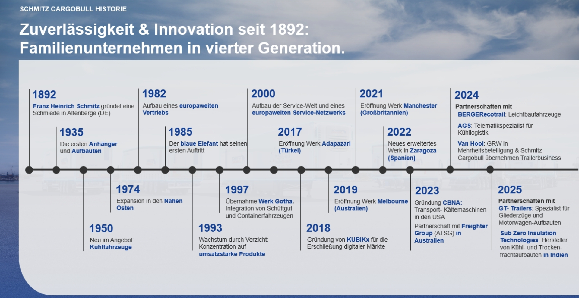2017 - Schmitz Cargobull feiert 125-jähriges JubiläumSchmitz Cargobull feiert im Geschäftsjahr 2017/2018 sein 125jähriges Bestehen und schreibt dabei eine nachhaltige Erfolgsgeschichte in der Transportwelt. Seit 1892 ist das Unternehmen von einer Schmiede zum europaweit führenden Trailer-Hersteller gewachsen. In nationalen Veranstaltungen wird europaweit an den Schmitz Cargobull Standorten das Jubiläumsjahr ab September 2017 gefeiert.