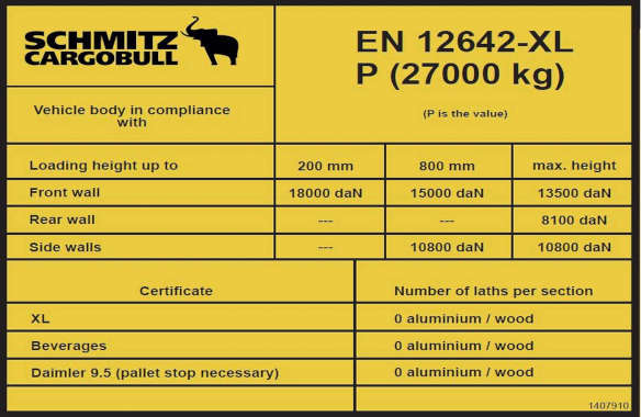Täiendavalt on paigaldatud laup- ja tagaseinale kleepsud, mis tõendavad pealisehitise tugevust vastavalt DIN EN 12642 koodile XL.