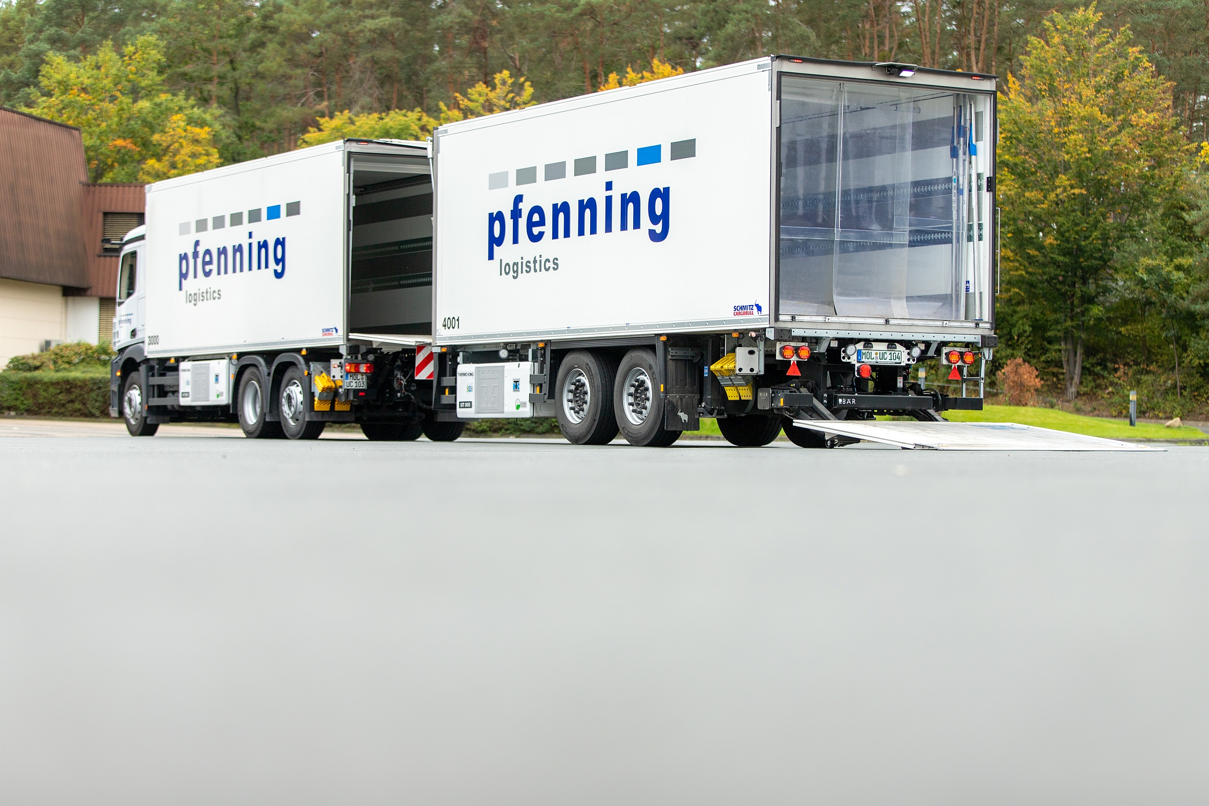 The optimised deep-freeze truck body and trailer combination also won over pfenning logistics. “This vehicle enables our drivers to load both deep-freeze box bodies at once. The trailer no longer has to be uncoupled during the process, and the entire truck and trailer combination only has to be driven up to the ramp once. That truly saves time,” explains Manuel Pfenning, Managing Director of the pfenning logistics group. With approximately 3,700 employees at 90 locations and a fleet of more than 800 trucks, pfenning logistics numbers among Germany’s topfull-service logistics providers. The multifunction floor in the body enables quick and easy load securing. The new partition wall in the bodies for multi-temperature transport is another clever solution. It can be divided 1/3 to 2/3, is longitudinally adjustable and can be repaired quickly without disassembly. This feature enables frozen and fresh products to be loaded and transported in the same body.