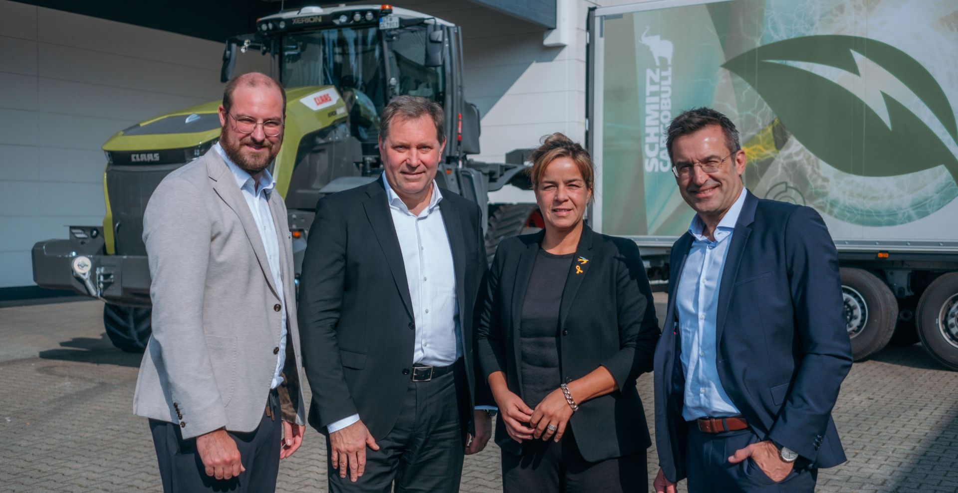 Image: From left: Dr Arno Kühn (Head of Strategy, R&D, Extended Management Board, it's OWL), Jan-Hendrik Mohr (CEO, CLAAS), Mona Neubaur (Minister for Economic Affairs, Industry, Climate Protection and Energy, North Rhine-Westphalia), Dr Günther Schweitzer (COO, Schmitz Cargobull)