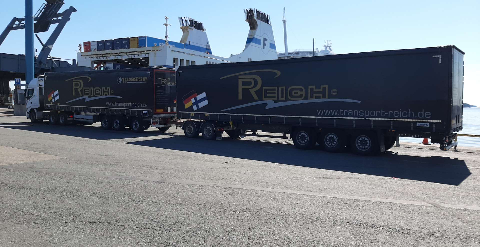 En Allemagne, deux tracteurs amènent les semi-remorques au ferry, à l’arrivée du ferry en Finlande, les deux semi-remorques sont reliées par un dolly, et la combinaison part sur la route, tractée par un seul tracteur.