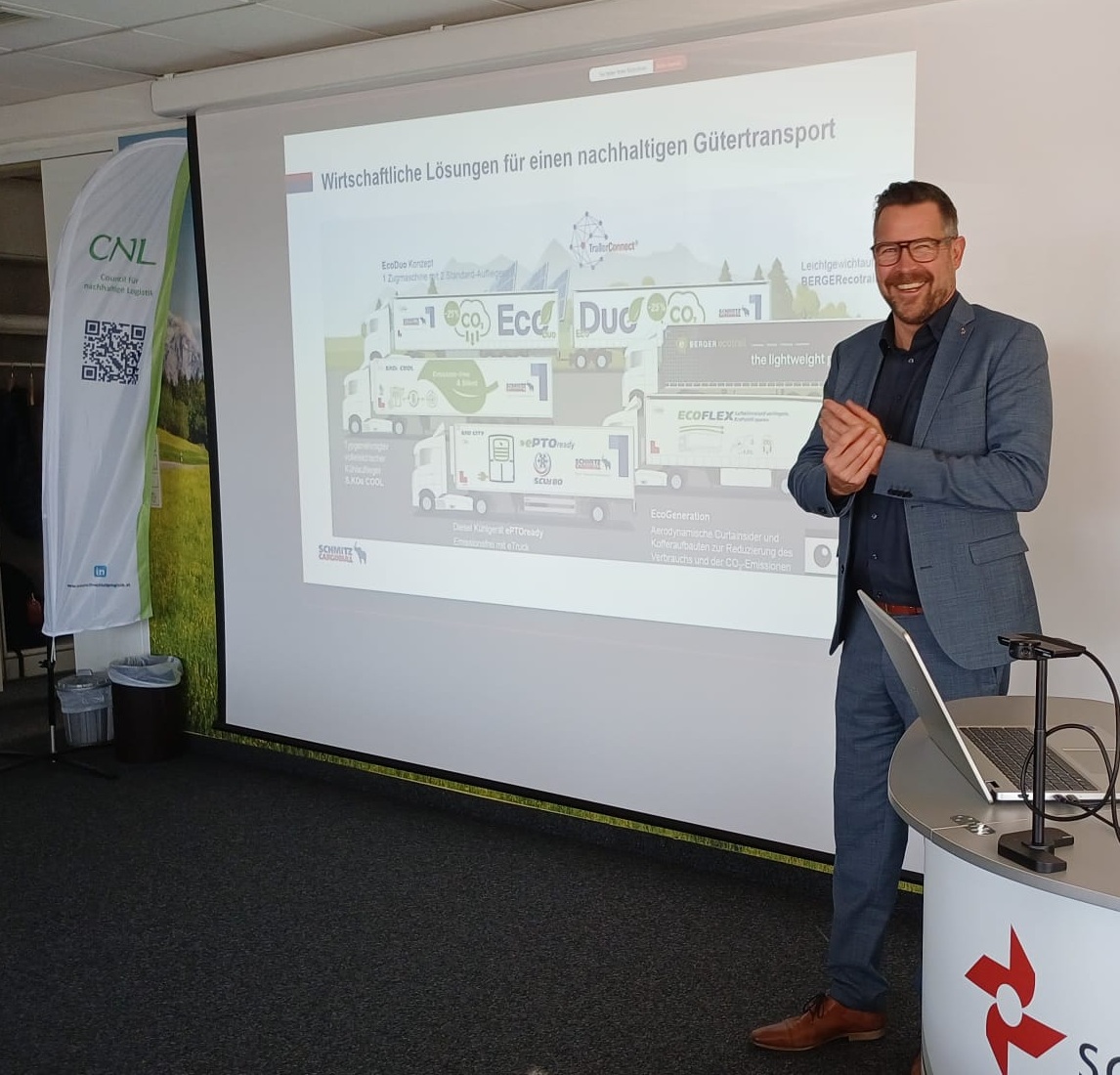 December 2025 - Schmitz Cargobull presented its all-electric S.KOe COOL semi-trailer at the "Council for Sustainable Logistics" (CNL) workshop in Austria. The event took place at Austrian logistics expert Schachinger Logistik and provided a platform for exchanging ideas on innovative solutions for decarbonising freight transport.