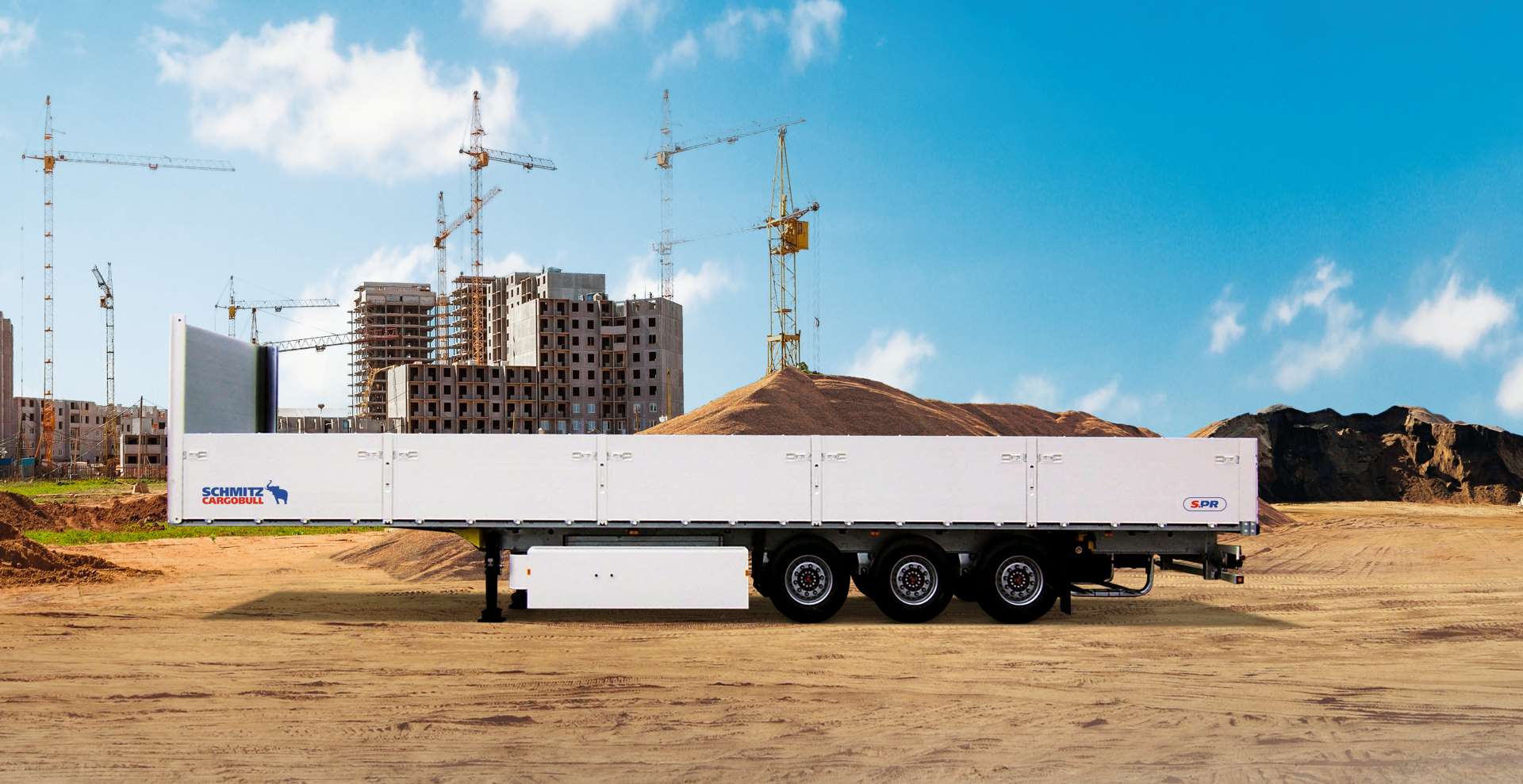 Бортовой полуприцеп S.PR BAU оптимален для перевозки стойких к атмосферным воздействиям грузов. Это надежное транспортное средство с усиленным шасси и съемными бортами удобно использовать для задач снабжения строительных объектов.