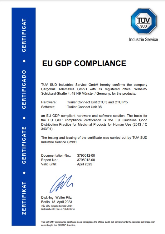 Schmitz Cargobull successfully passed and receives an official certificate with a test and accreditation number from TÜV Süd. The certificate for the GDP audit can be requested from Schmitz Cargobull at any time.